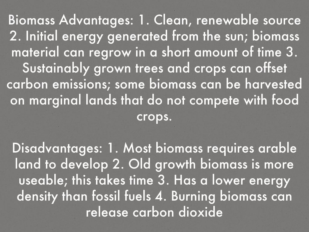 Disadvantages: 1. Most biomass requires arable land to develop 2. Old growth biomass is more useable; this takes time 3. Has a lower energy density than fossil fuels 4. Burning biomass can release carbon dioxide