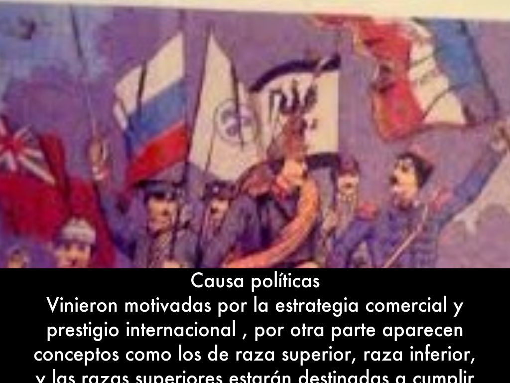 Vinieron motivadas por la estrategia comercial y prestigio internacional , por otra parte aparecen conceptos como los de raza superior, raza inferior, y las razas superiores estarán destinadas a cumplir una función diferente imponiendo con ello la civilización occidental.