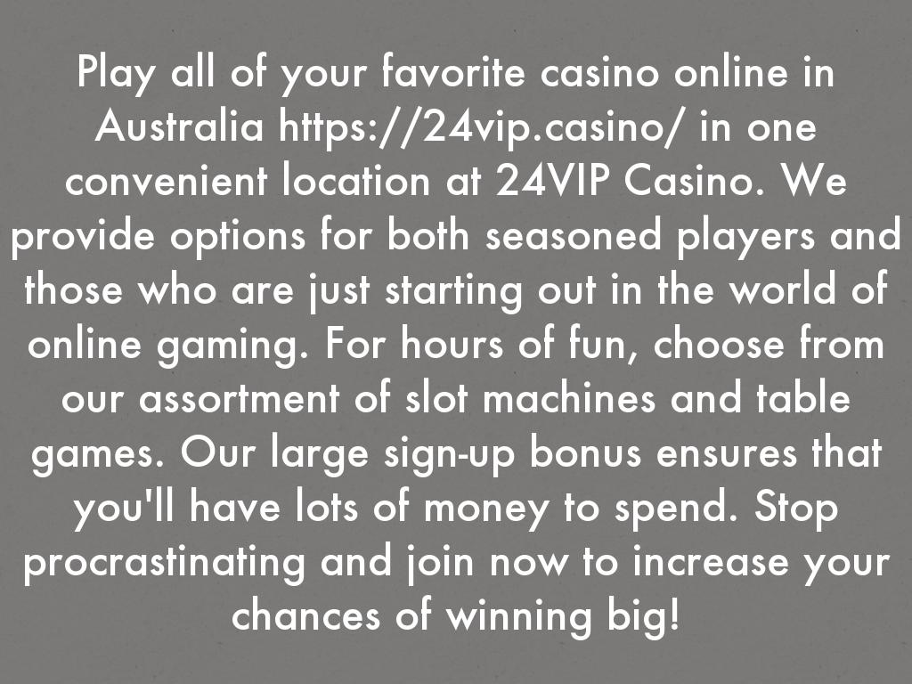 Play all of your favorite casino online in Australia https://24vip.casino/ in one convenient location at 24VIP Casino. We provide options for both seasoned players and those who are just starting out in the world of online gaming. For hours of fun, choose from our assortment of slot machines and table games. Our large sign-up bonus ensures that you'll have lots of money to spend. Stop procrastinating and join now to increase your chances of winning big!