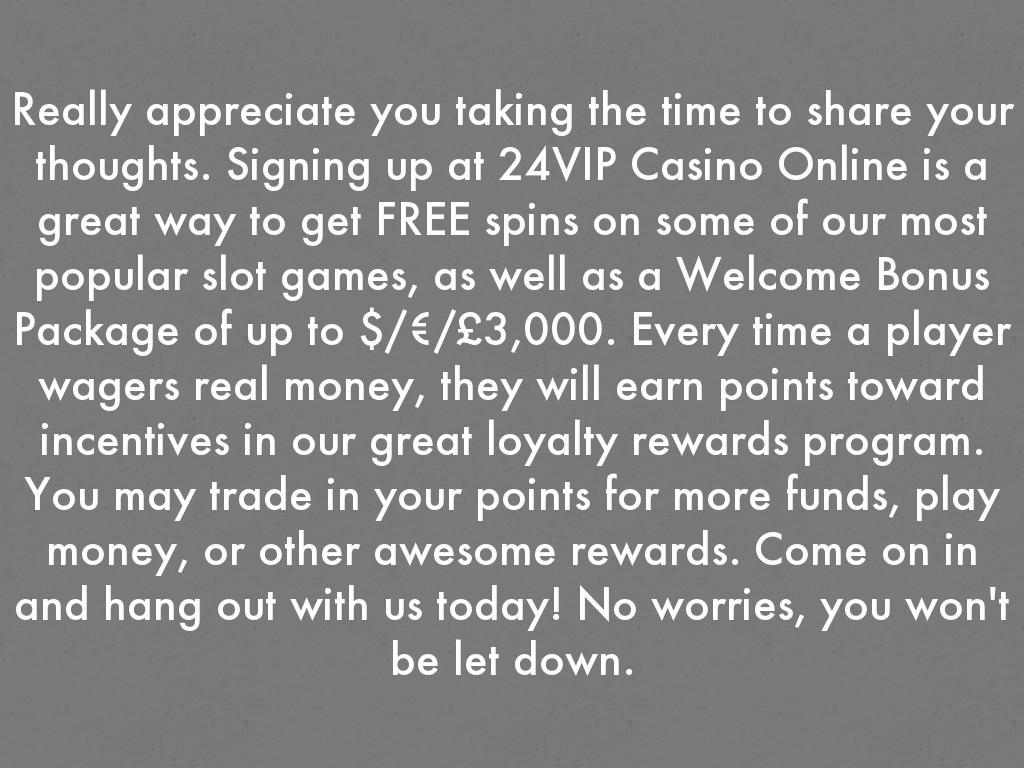 Really appreciate you taking the time to share your thoughts. Signing up at 24VIP Casino Online is a great way to get FREE spins on some of our most popular slot games, as well as a Welcome Bonus Package of up to $/€/£3,000. Every time a player wagers real money, they will earn points toward incentives in our great loyalty rewards program. You may trade in your points for more funds, play money, or other awesome rewards. Come on in and hang out with us today! No worries, you won't be let down.