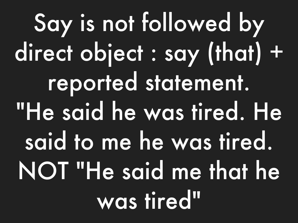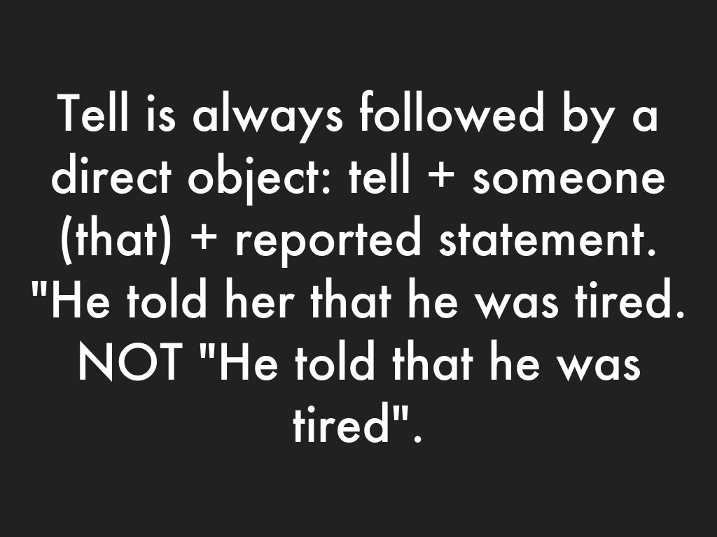 Tell is always followed by a direct object: tell + someone (that) + reported statement.