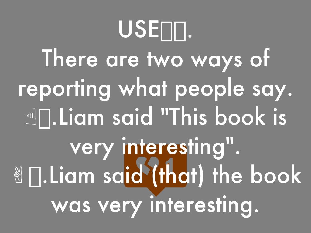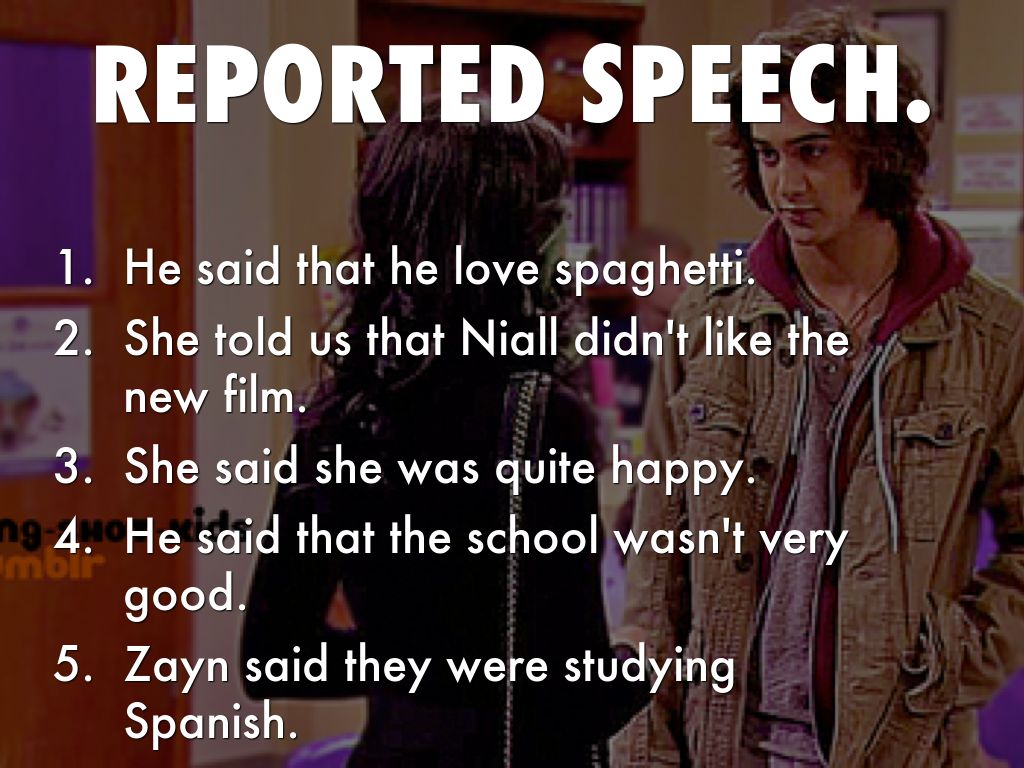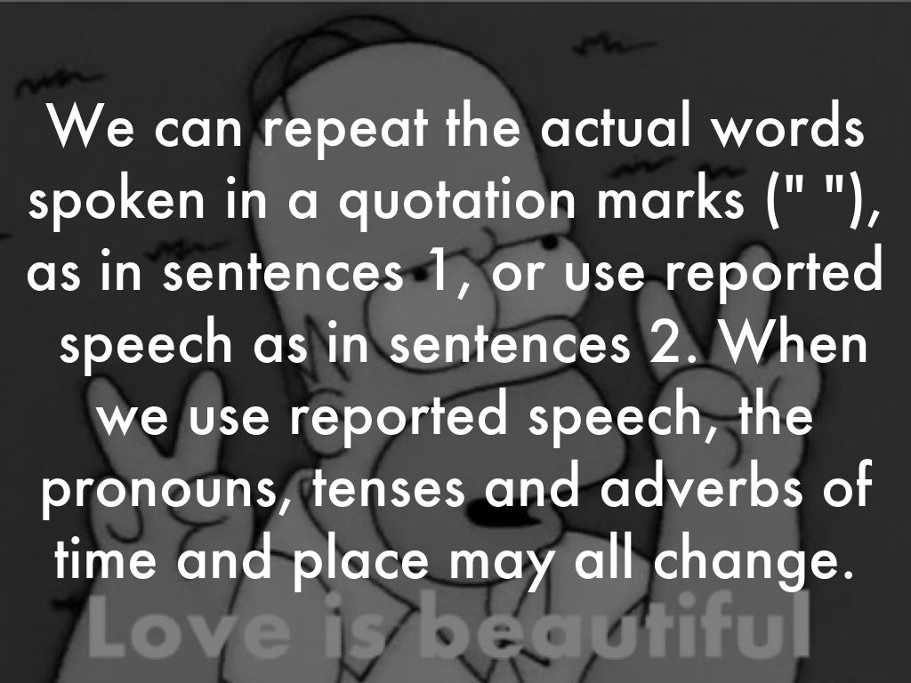 We can repeat the actual words spoken in a quotation marks (" "), as in sentences 1, or use reported speech as in sentences 2. When we use reported speech, the pronouns, tenses and adverbs of time and place may all change.