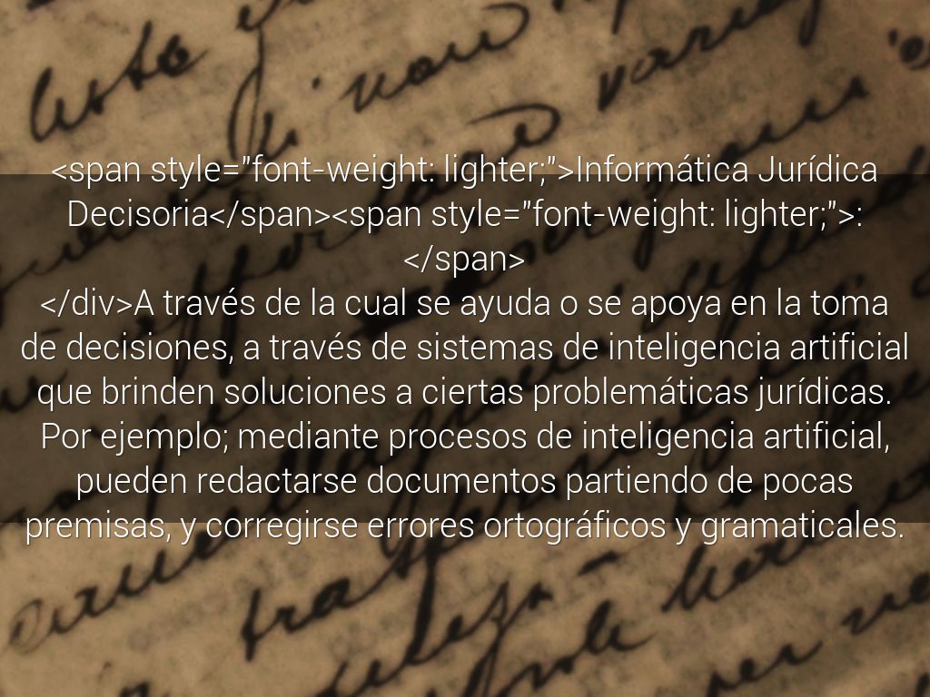 A través de la cual se ayuda o se apoya en la toma de decisiones, a través de sistemas de inteligencia artificial que brinden soluciones a ciertas problemáticas jurídicas. Por ejemplo; mediante procesos de inteligencia artificial, pueden redactarse documentos partiendo de pocas premisas, y corregirse errores ortográficos y gramaticales.