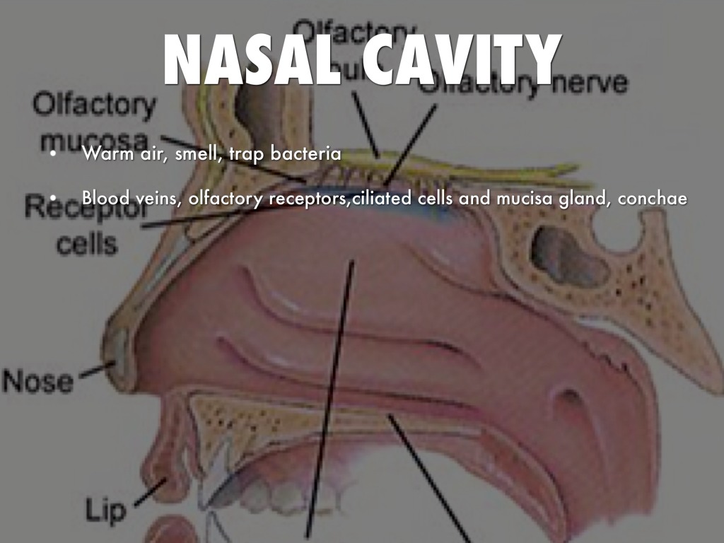 Blood veins, olfactory receptors,ciliated cells and mucisa gland, conchae