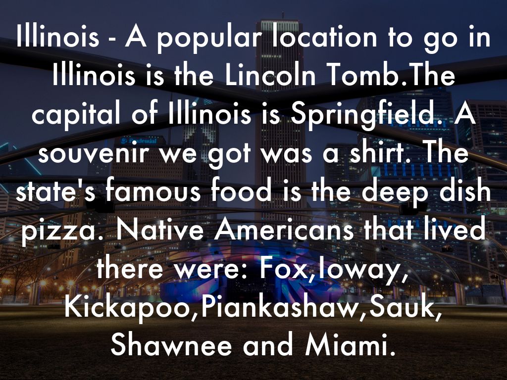 Illinois - A popular location to go in Illinois is the Lincoln Tomb.The capital of Illinois is Springfield. A souvenir we got was a shirt. The state's famous food is the deep dish pizza. Native Americans that lived there were: Fox,Ioway, Kickapoo,Piankashaw,Sauk, Shawnee and Miami.