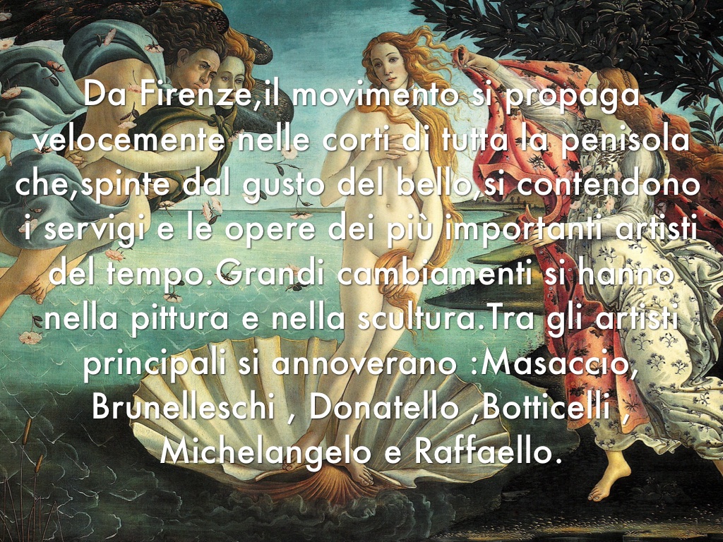 Da Firenze,il movimento si propaga velocemente nelle corti di tutta la penisola che,spinte dal gusto del bello,si contendono i servigi e le opere dei più importanti artisti del tempo.Grandi cambiamenti si hanno nella pittura e nella scultura.Tra gli artisti principali si annoverano :Masaccio, Brunelleschi , Donatello ,Botticelli , Michelangelo e Raffaello.
