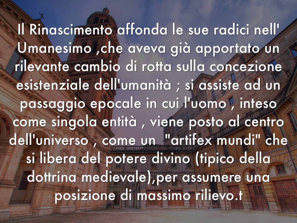 Il Rinascimento affonda le sue radici nell' Umanesimo che aveva già apportato un rilevante cambio di rotta sulla concezione esistenziale dell'umanità ; si assiste ad un passaggio epocale in cui l'uomo , inteso come singola entità , viene posto al centro dell'universo , come un "artifex mundi" che si libera dal potere divino (tipico della dottrina medievale),per assumere una posizione di massimo rilievo.