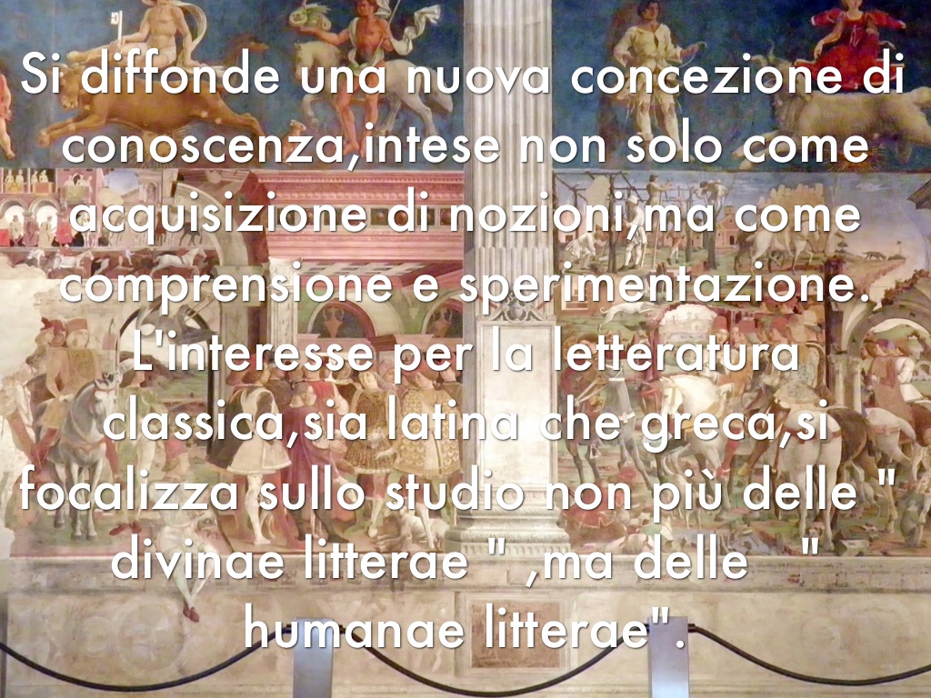 Si diffonde una nuova concezione di conoscenza,intesa non solo come acquisizione di nozioni,ma come comprensione e sperimentazione. L'interesse per la letteratura classica,sia latina che greca,si focalizza sullo studio non più delle " divinae litterae " ma delle " humanae litterae".