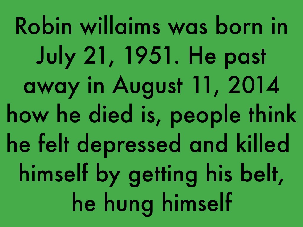 Robin willaims was born in July 21, 1951. He past away in August 11, 2014 how he died is, people think he felt depressed and killed himself by getting his belt, he hung himself