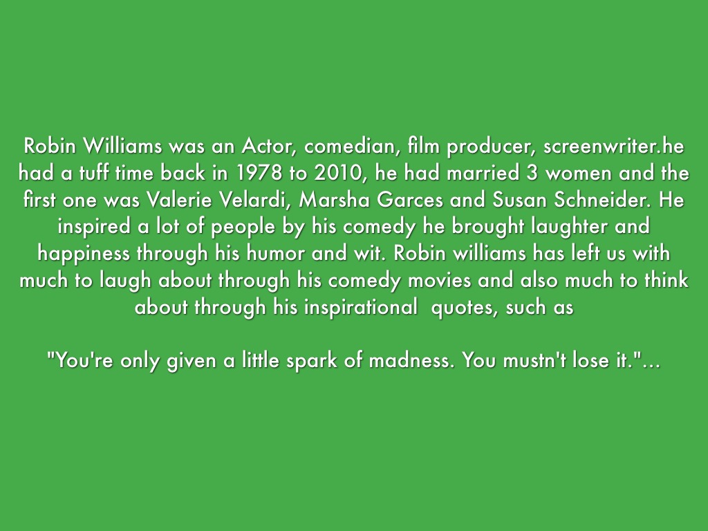 Robin Williams was an Actor, comedian, film producer, screenwriter.he had a tuff time back in 1978 to 2010, he had married 3 women and the first one was Valerie Velardi, Marsha Garces and Susan Schneider. He inspired a lot of people by his comedy he brought laughter and happiness through his humor and wit. Robin williams has left us with much to laugh about through his comedy movies and also much to think about through his inspirational quotes, such as