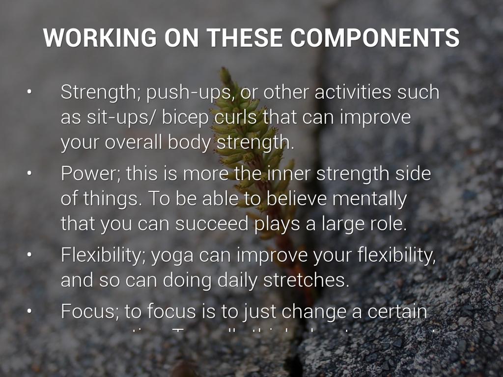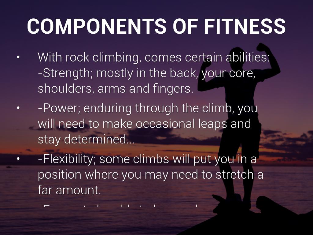 I think that I should rock climb more often, complete some of the activities I listed previously to up these necessary components of fitness.