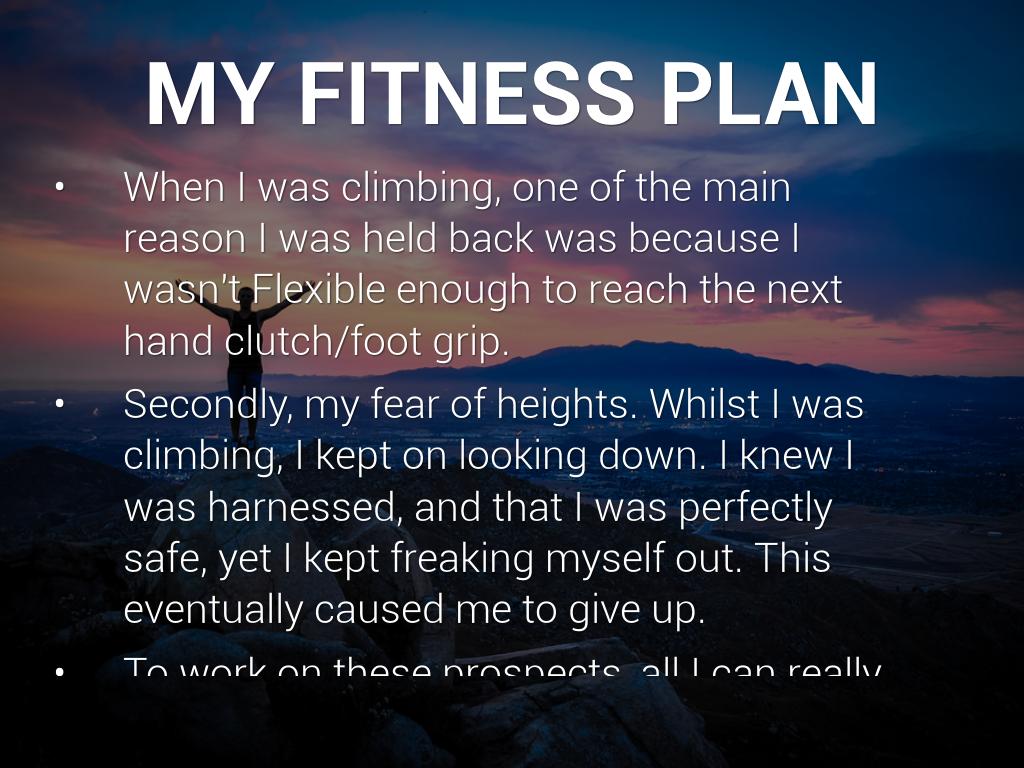 To work on these prospects, all I can really do is keep climbing. I can get over this fear if I continue. Same with flexibility, but I could also stretch.