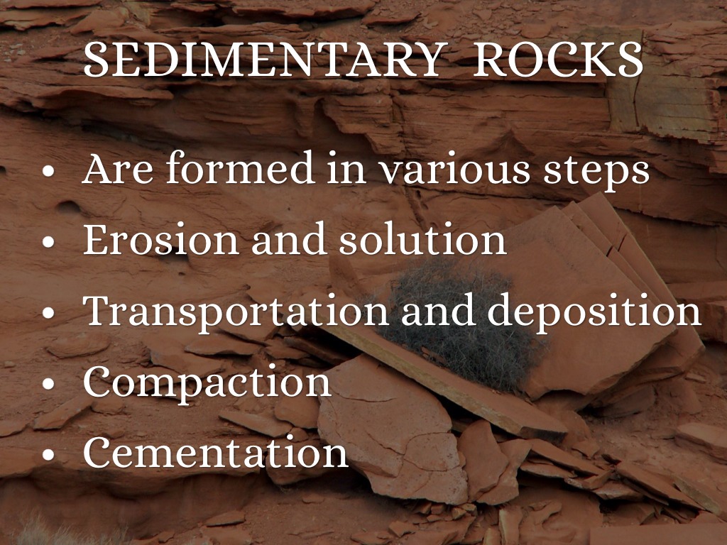 Then the sediments from eroded rocks ( formed over millions of years) gradually turn into sedimentary rocks after more time has passed