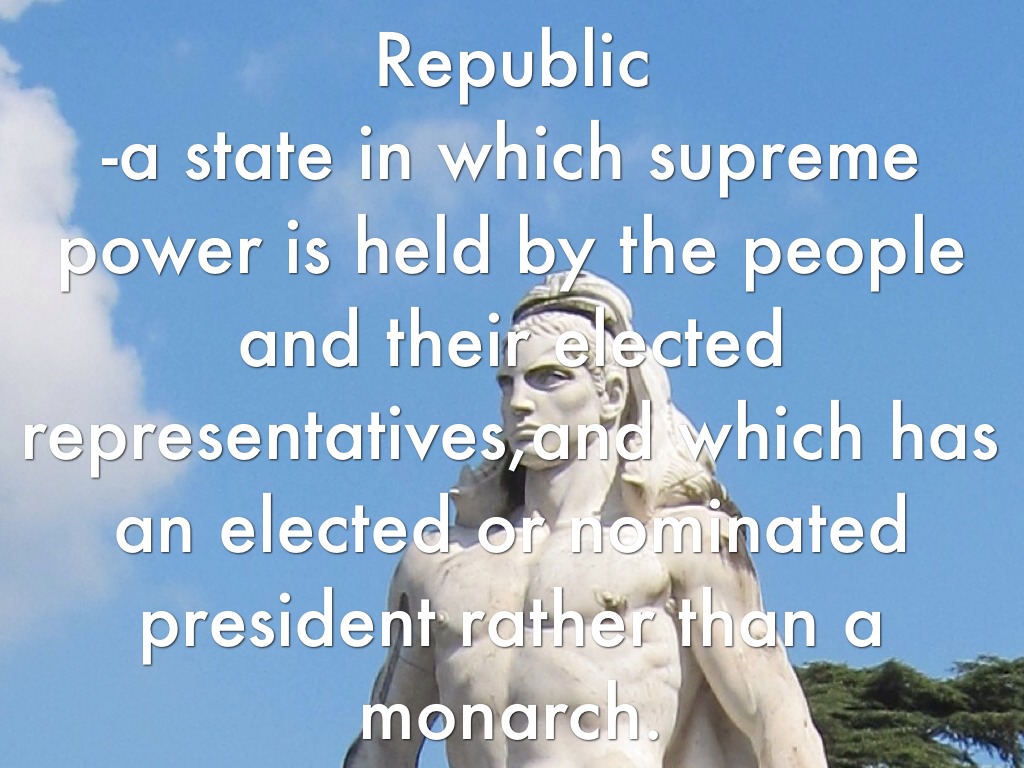 Republic -a state in which supreme power is held by the people and their elected representatives,and which has an elected or nominated president rather than a monarch.