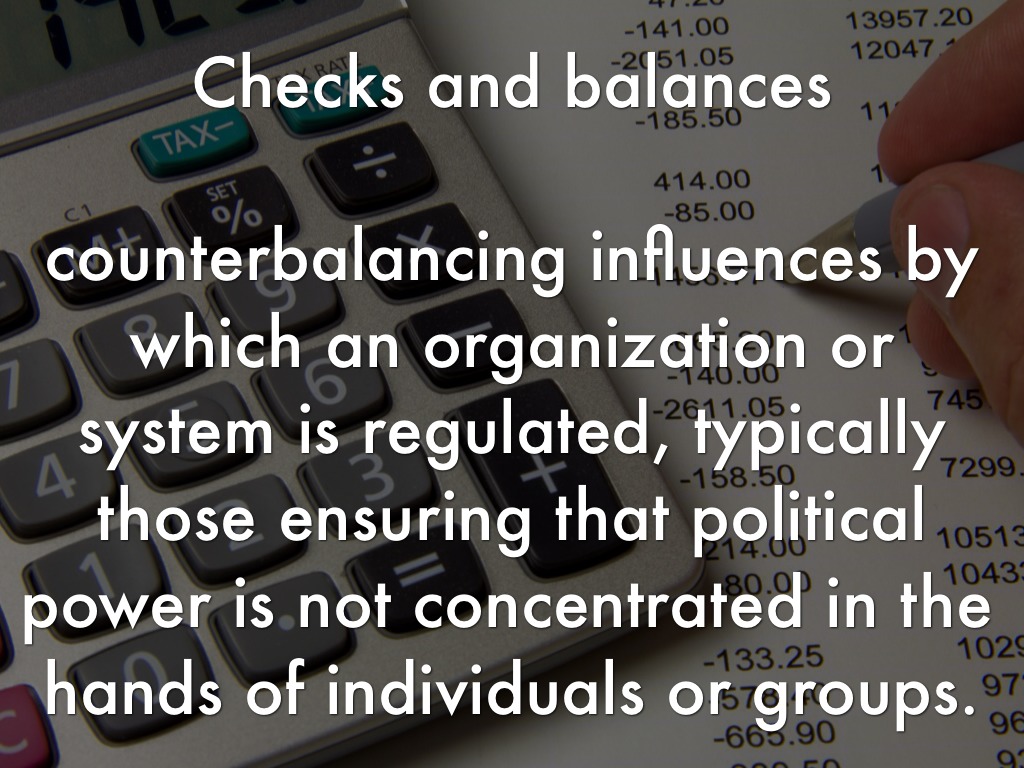 counterbalancing influences by which an organization or system is regulated, typically those ensuring that political power is not concentrated in the hands of individuals or groups.