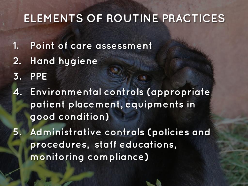 Environmental controls (appropriate patient placement, equipments in good condition)