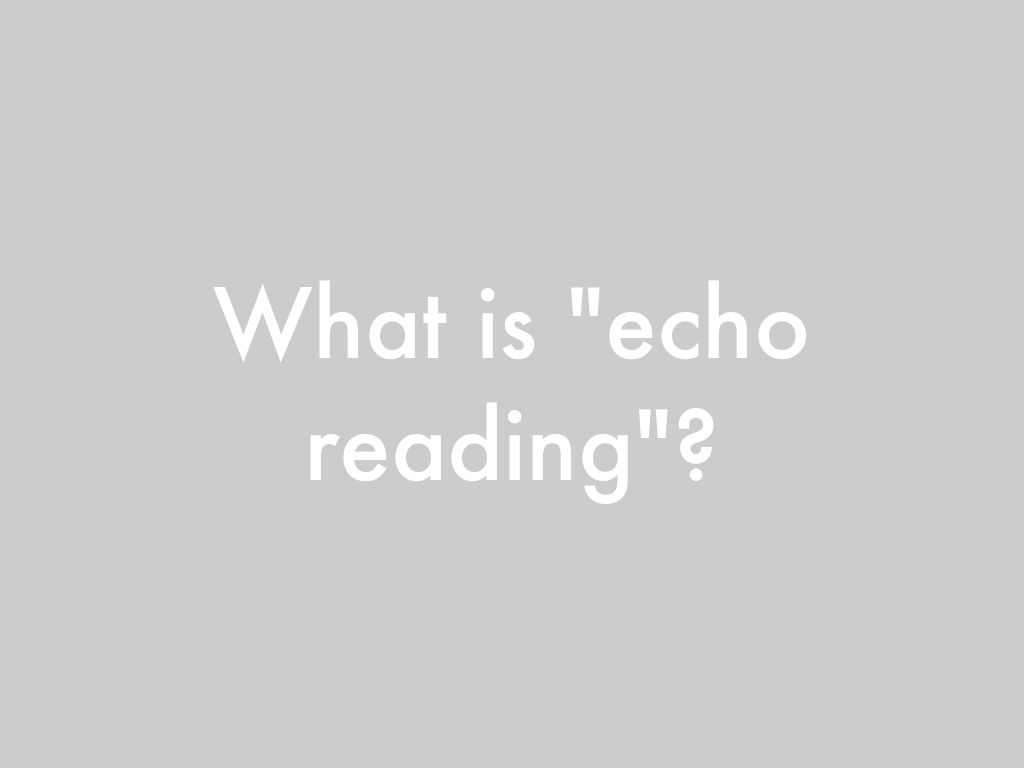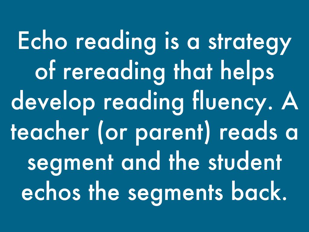Echo reading is a strategy of rereading that helps develop reading fluency. A teacher (or parent) reads a segment and the student echos the segments back.