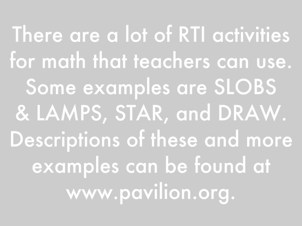 There are a lot of RTI activities for math that teachers can use. Some examples are SLOBS
