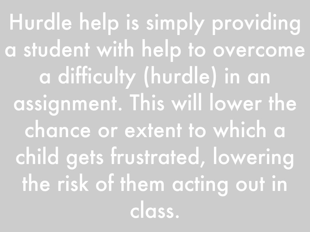 Hurdle help is simply providing a student with help to overcome a difficulty (hurdle) in an assignment. This will lower the chance or extent to which a child gets frustrated, lowering the risk of them acting out in class.