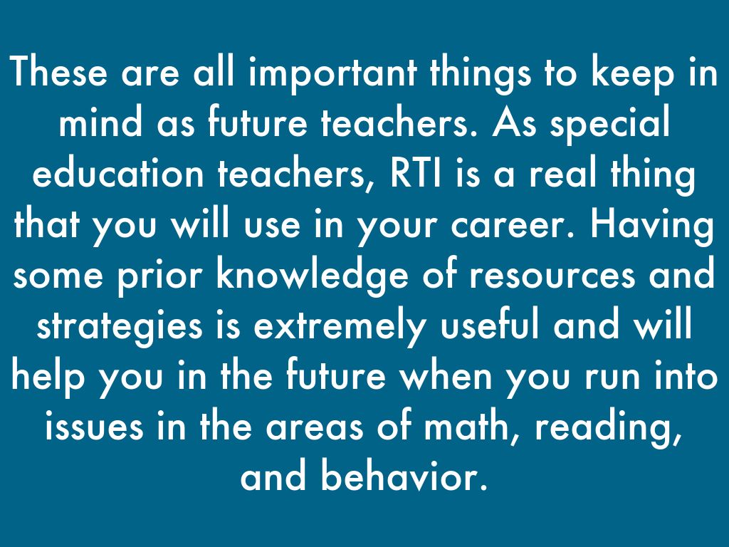 These are all important things to keep in mind as future teachers. As special education teachers, RTI is a real thing that you will use in your career. Having some prior knowledge of resources and strategies is extremely useful and will help you in the future when you run into issues in the areas of math, reading, and behavior.