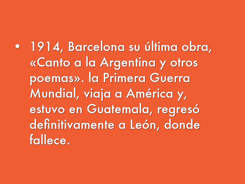 1914, Barcelona su última obra, «Canto a la Argentina y otros poemas». la Primera Guerra Mundial, viaja a América y, estuvo en Guatemala, regresó definitivamente a León, donde fallece.