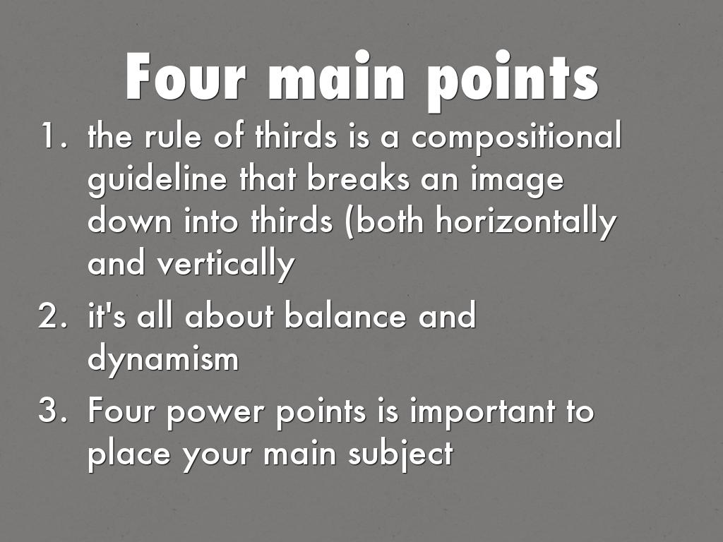 • the rule of thirds is a compositional guideline that breaks an image down into thirds (both horizontally and vertically