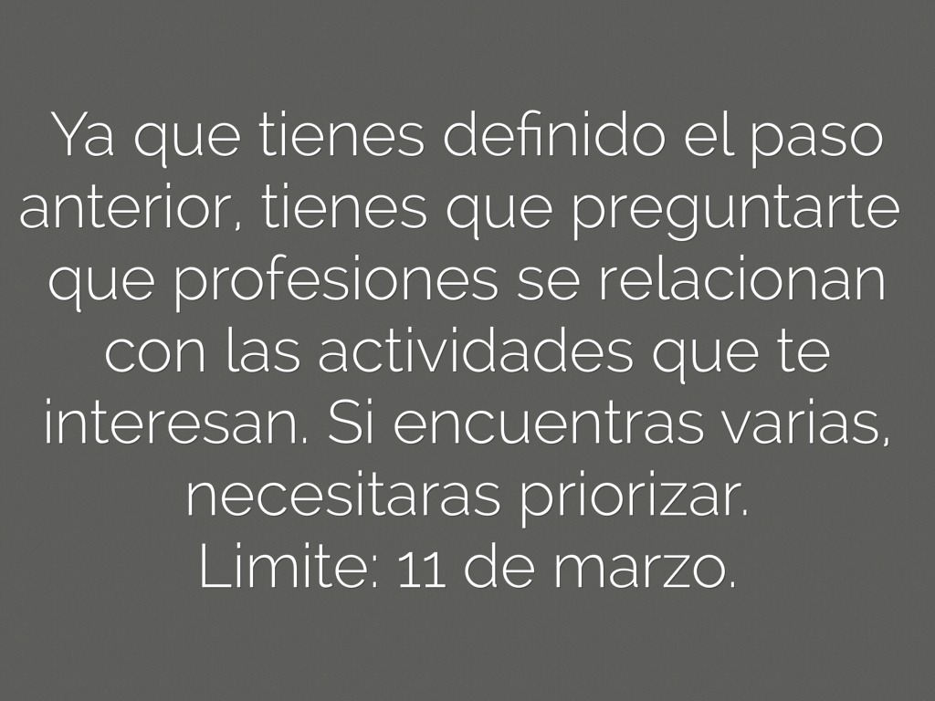 Ya que tienes definido el paso anterior, tienes que preguntarte que profesiones se relacionan con las actividades que te interesan. Si encuentras varias, necesitaras priorizar.