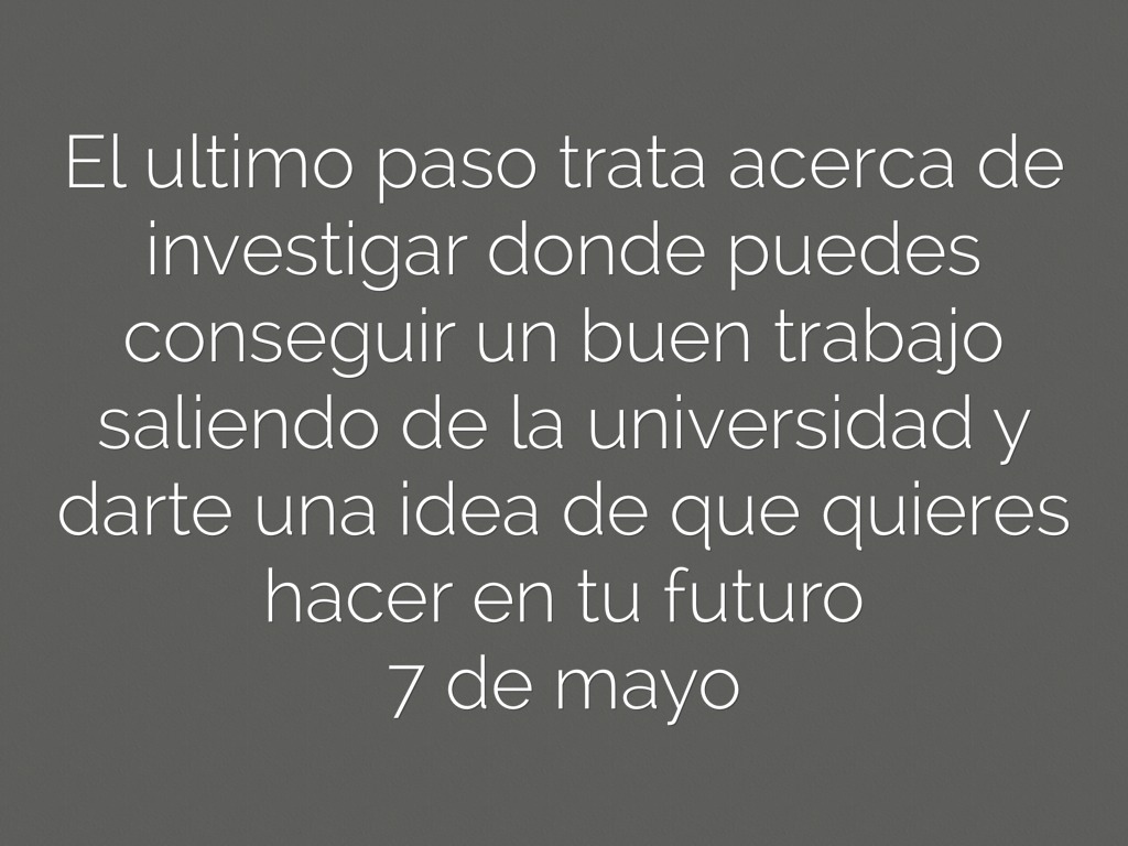 El ultimo paso trata acerca de investigar donde puedes conseguir un buen trabajo saliendo de la universidad y darte una idea de que quieres hacer en tu futuro