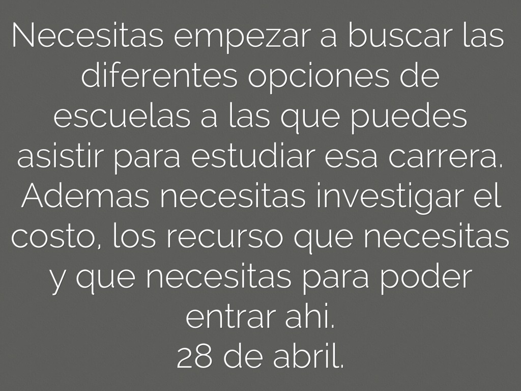 Necesitas empezar a buscar las diferentes opciones de escuelas a las que puedes asistir para estudiar esa carrera. Ademas necesitas investigar el costo, los recurso que necesitas y que necesitas para poder entrar ahi.