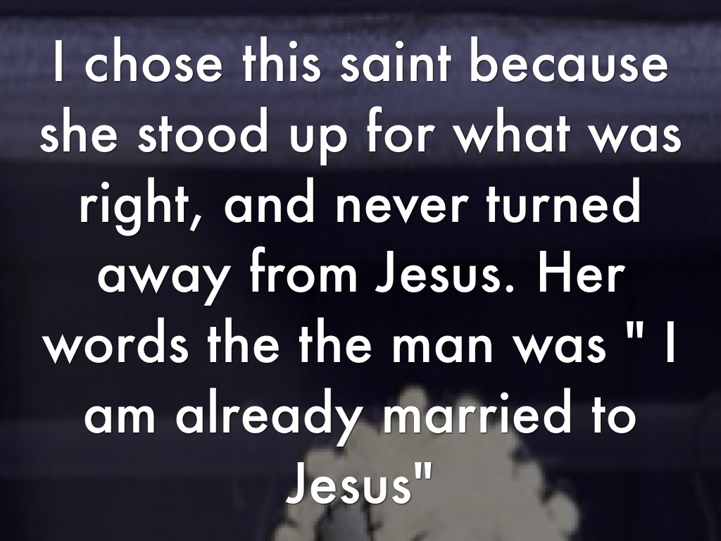 I chose this saint because she stood up for what was right, and never turned away from Jesus. Her words the the man was " I am already married to Jesus"