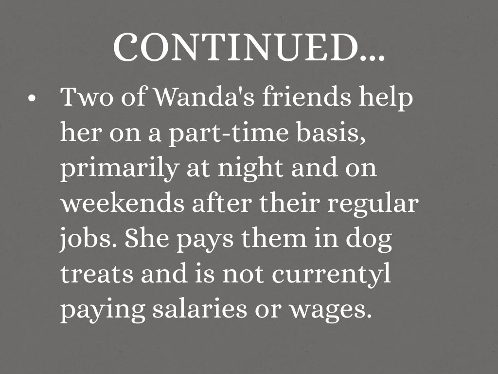Two of Wanda's friends help her on a part-time basis, primarily at night and on weekends after their regular jobs. She pays them in dog treats and is not currentyl paying salaries or wages.