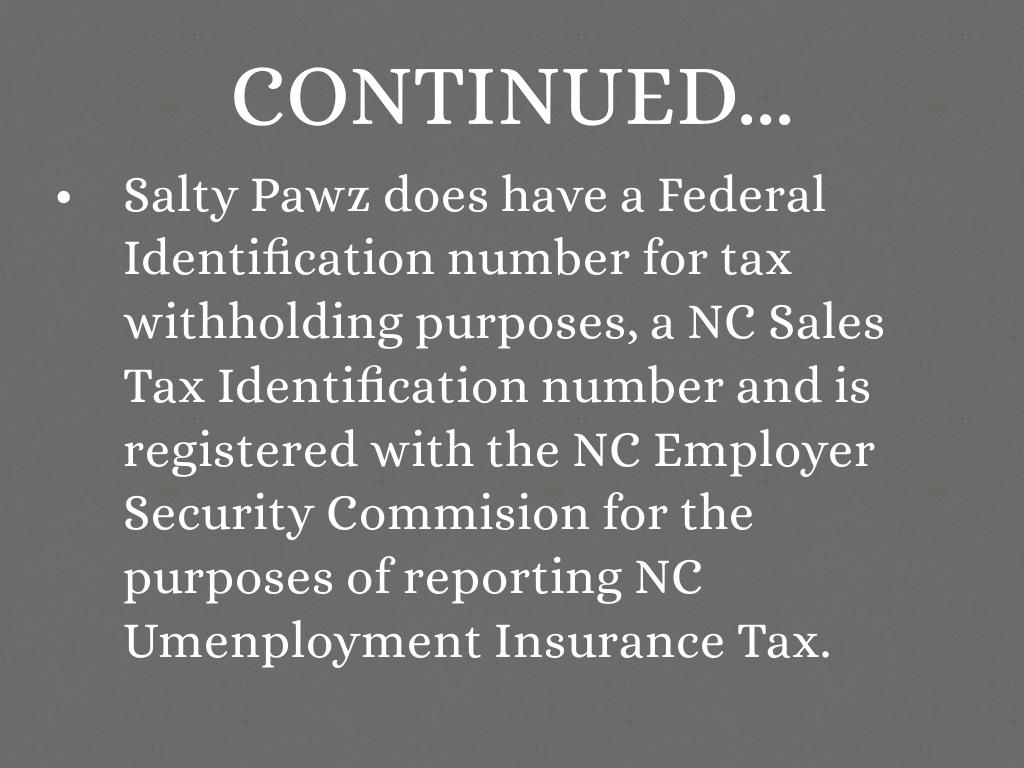 Salty Pawz does have a Federal Identification number for tax withholding purposes, a NC Sales Tax Identification number and is registered with the NC Employer Security Commision for the purposes of reporting NC Umenployment Insurance Tax.