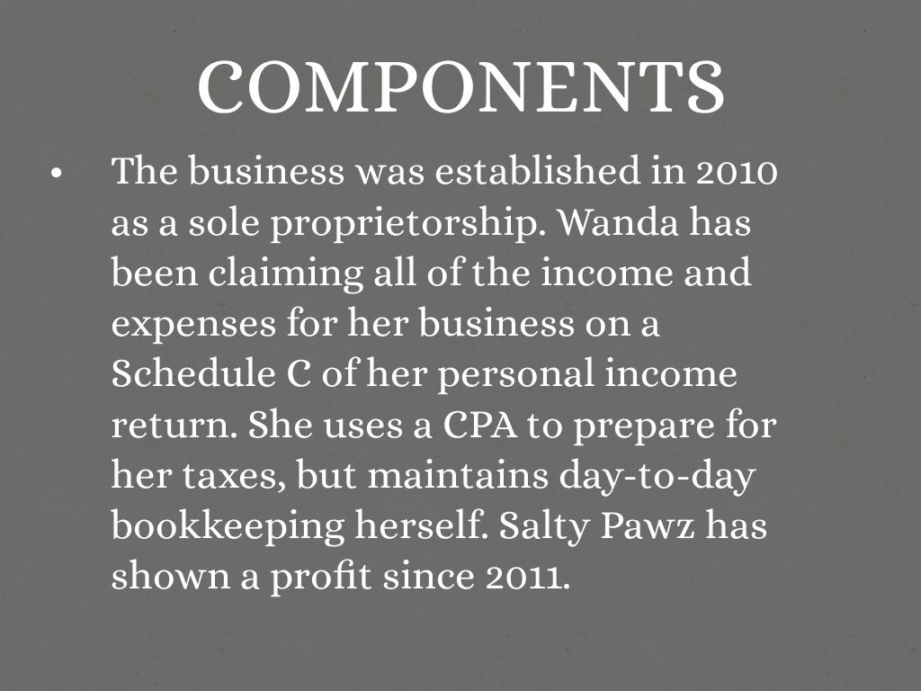The business was established in 2010 as a sole proprietorship. Wanda has been claiming all of the income and expenses for her business on a Schedule C of her personal income return. She uses a CPA to prepare for her taxes, but maintains day-to-day bookkeeping herself. Salty Pawz has shown a profit since 2011.