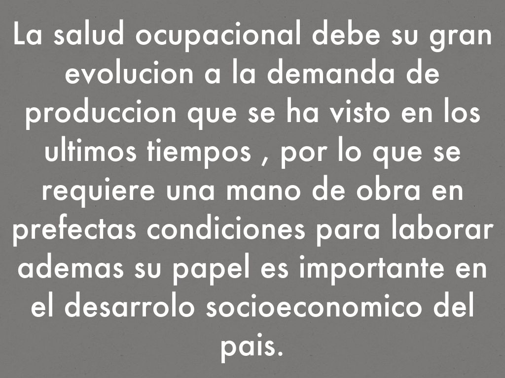 La salud ocupacional debe su gran evolucion a la demanda de produccion que se ha visto en los ultimos tiempos , por lo que se requiere una mano de obra en prefectas condiciones para laborar ademas su papel es importante en el desarrolo socioeconomico del pais.