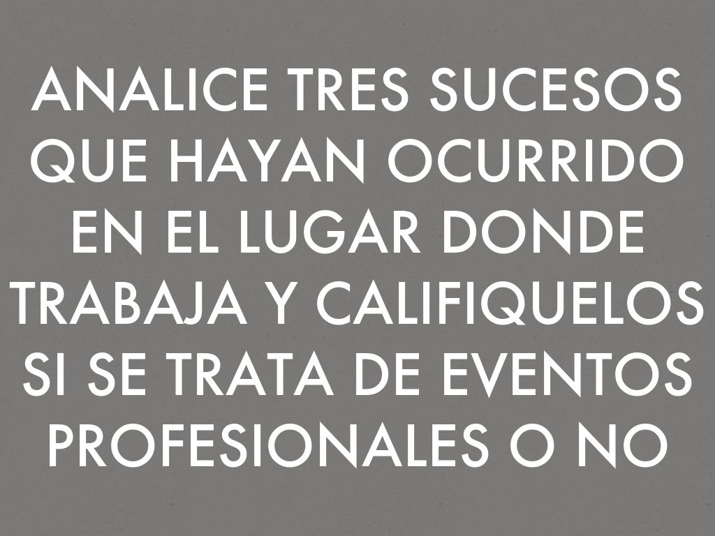 ANALICE TRES SUCESOS QUE HAYAN OCURRIDO EN EL LUGAR DONDE TRABAJA Y CALIFIQUELOS SI SE TRATA DE EVENTOS PROFESIONALES O NO
