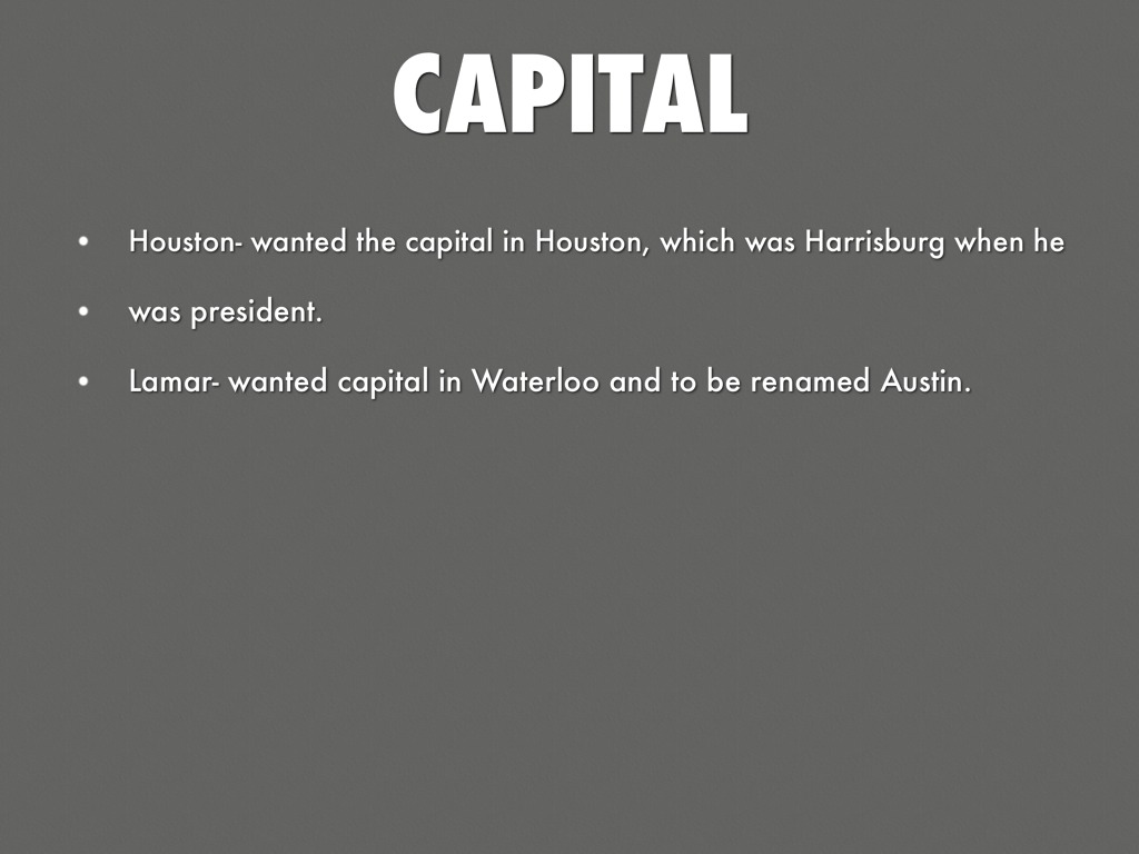 Lamar- wanted capital in Waterloo and to be renamed Austin.