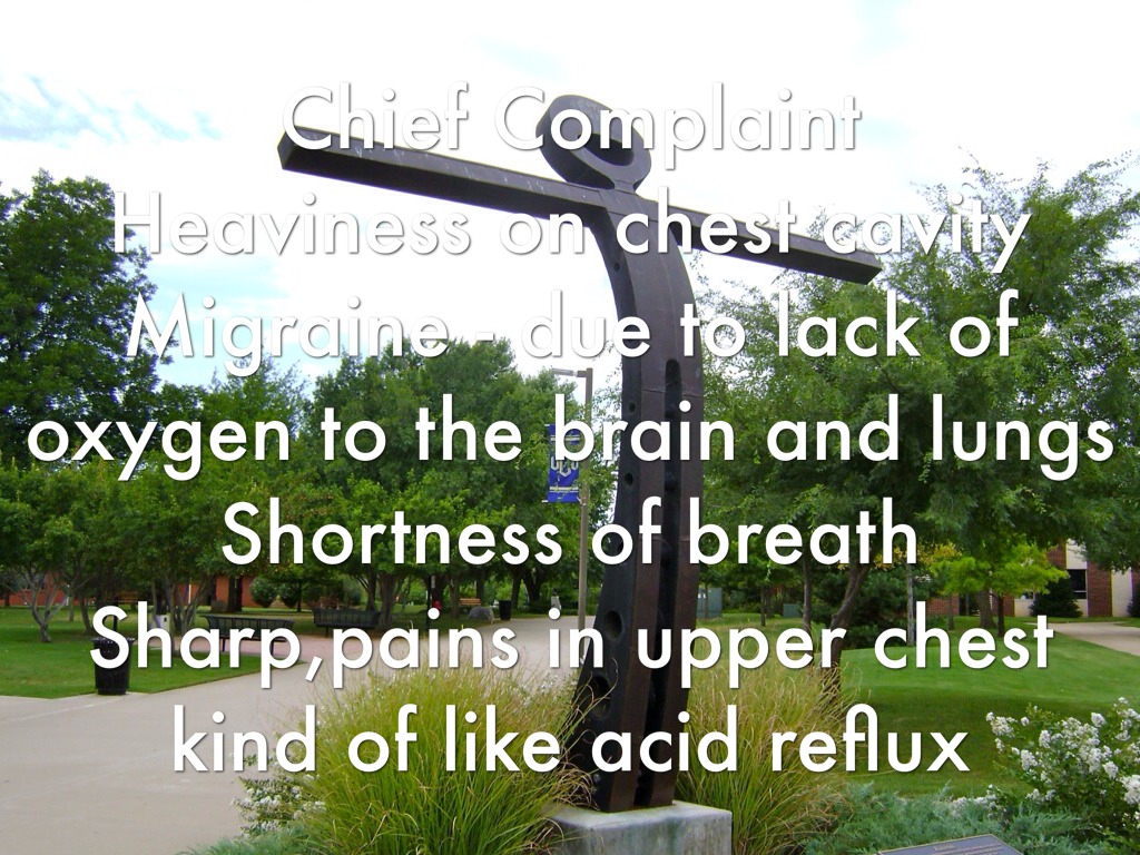 Chief Complaint Heaviness on chest cavity Migraine - due to lack of oxygen to the brain and lungs Shortness of breath Sharp,pains in upper chest kind of like acid reflux