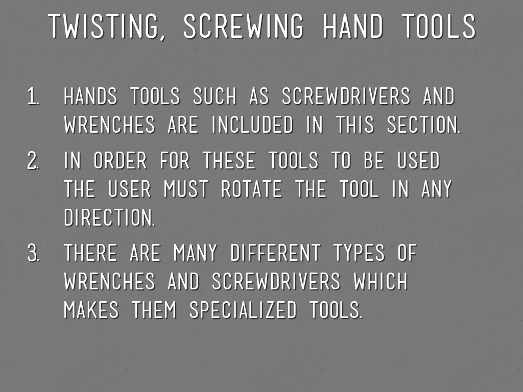 - hands tools such as screwdrivers and wrenches are included in this section.