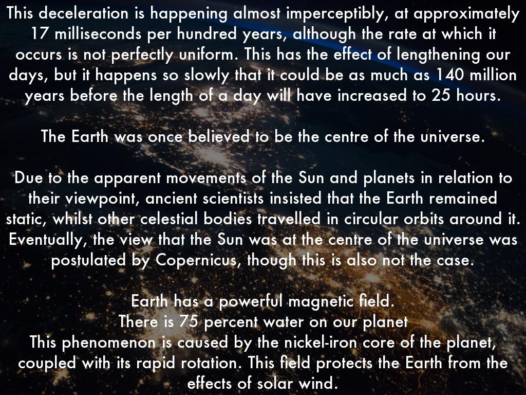 This deceleration is happening almost imperceptibly, at approximately 17 milliseconds per hundred years, although the rate at which it occurs is not perfectly uniform. This has the effect of lengthening our days, but it happens so slowly that it could be as much as 140 million years before the length of a day will have increased to 25 hours.