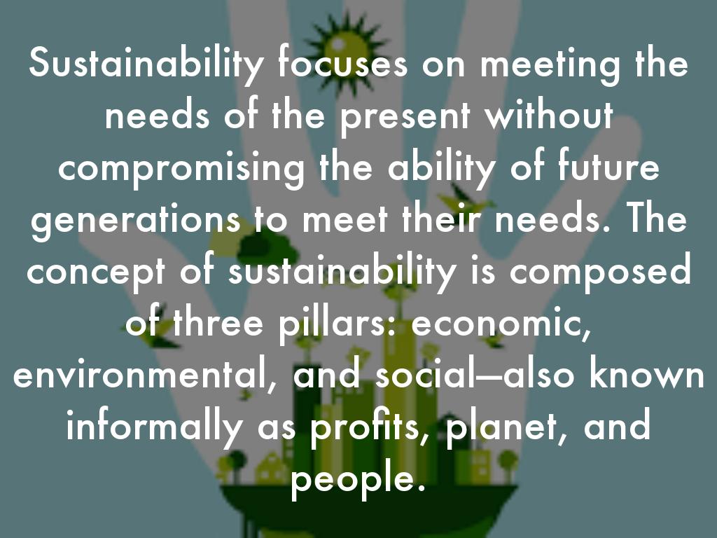 Sustainability focuses on meeting the needs of the present without compromising the ability of future generations to meet their needs. The concept of sustainability is composed of three pillars: economic, environmental, and social—also known informally as profits, planet, and people.