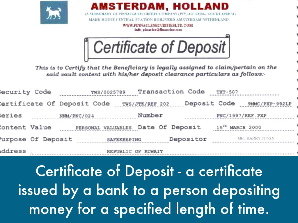 Certificate of Deposit - a certificate issued by a bank to a person depositing money for a specified length of time.