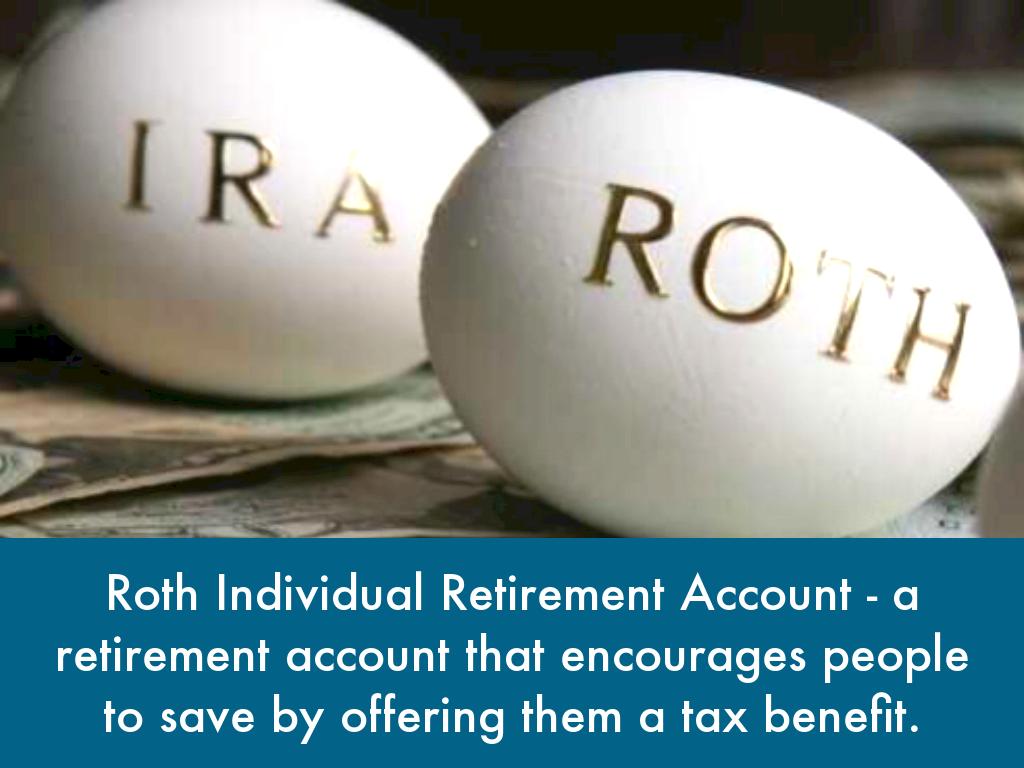 Roth Individual Retirement Account - a retirement account that encourages people to save by offering them a tax benefit.
