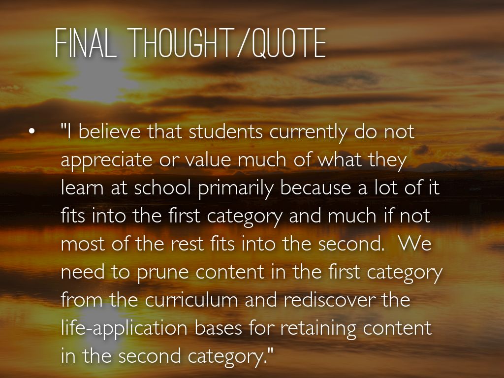 "I believe that students currently do not appreciate or value much of what they learn at school primarily because a lot of it fits into the first category and much if not most of the rest fits into the second. We need to prune content in the first category from the curriculum and rediscover the life-application bases for retaining content in the second category."