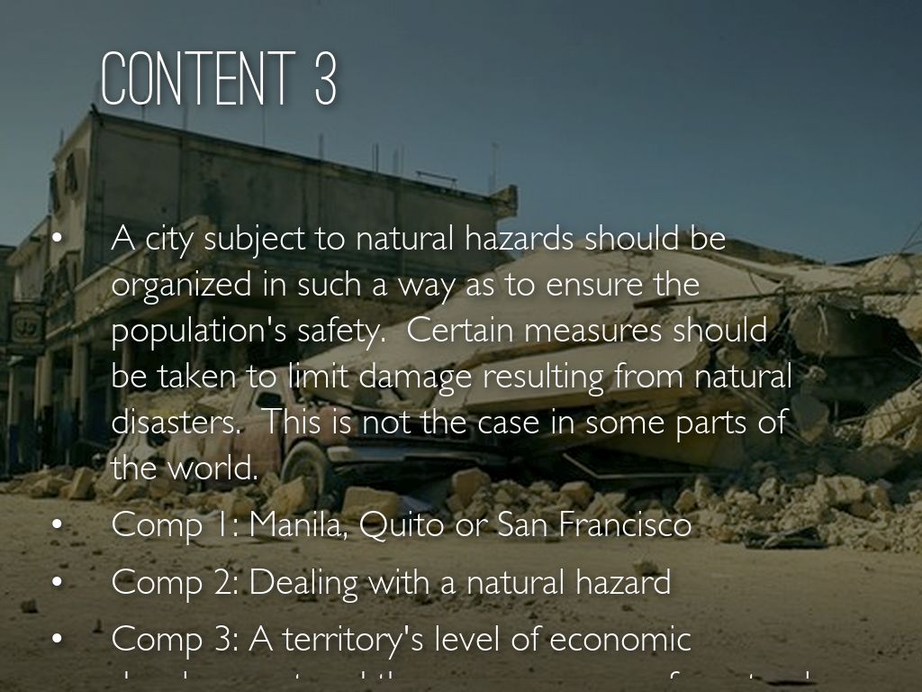 A city subject to natural hazards should be organized in such a way as to ensure the population's safety. Certain measures should be taken to limit damage resulting from natural disasters. This is not the case in some parts of the world.