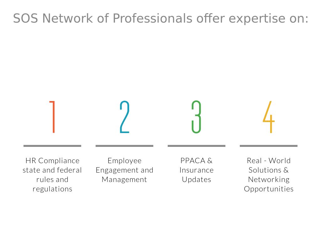 Our professional network consists of: SPHR Consultants, Leadership and Employee Engagement Consultants, School Statisticians, Insurance Agents, Certified PPACA Experts, Technology & Software Experts, Facility Management and LEED Certified Consultants, and Accounting Experts. SOS members enjoy a professional network of professionals that understand schools.