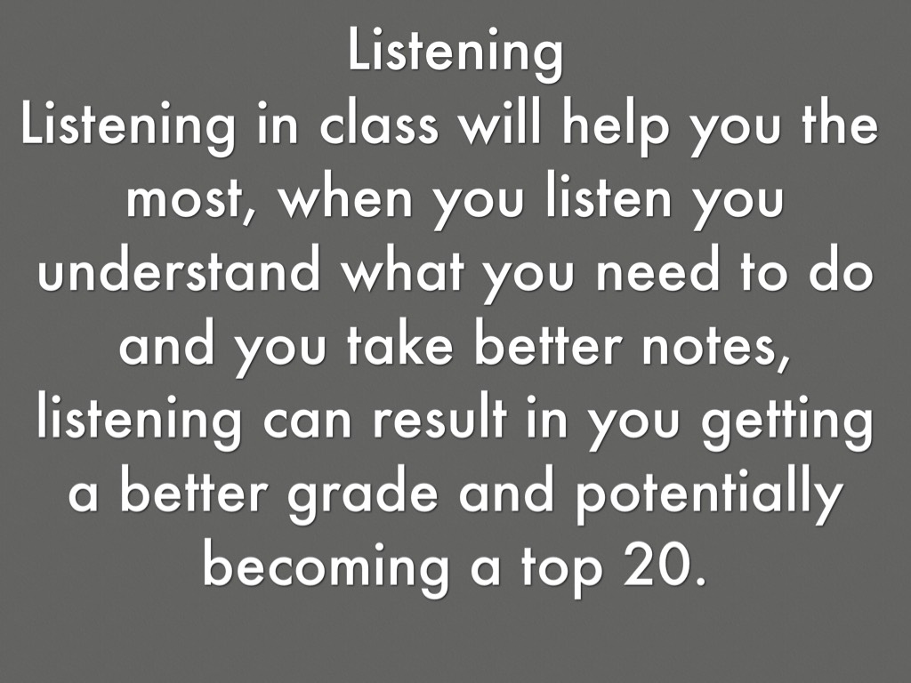 Listening in class will help you the most, when you listen you understand what you need to do and you take better notes, listening can result in you getting a better grade and potentially becoming a top 20.