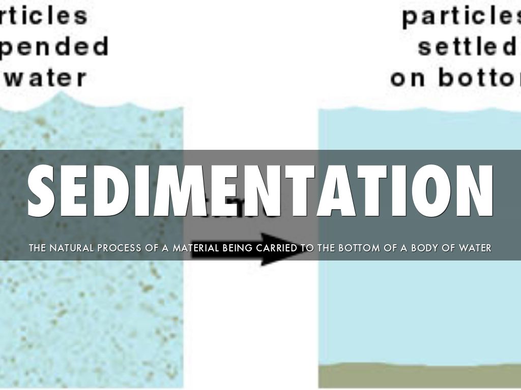 THE NATURAL PROCESS OF A MATERIAL BEING CARRIED TO THE BOTTOM OF A BODY OF WATER