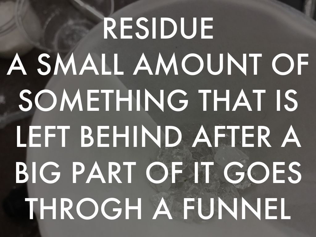 A SMALL AMOUNT OF SOMETHING THAT IS LEFT BEHIND AFTER A BIG PART OF IT GOES THROGH A FUNNEL
