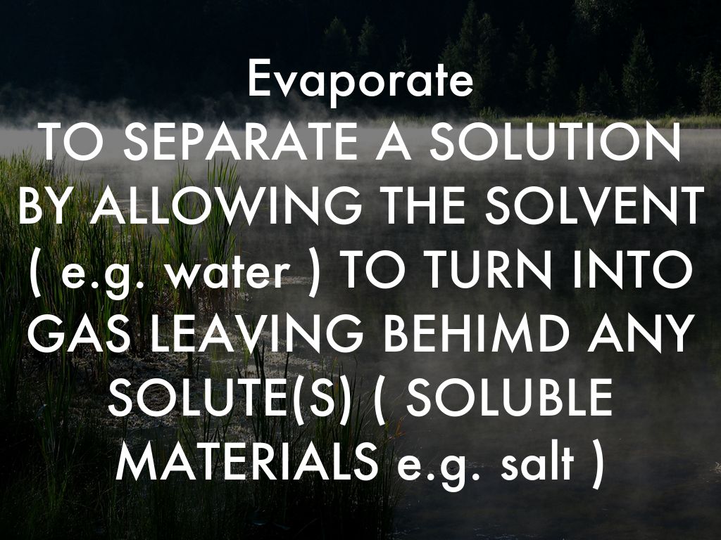 TO SEPARATE A SOLUTION BY ALLOWING THE SOLVENT ( e.g. water ) TO TURN INTO GAS LEAVING BEHIMD ANY SOLUTE(S) ( SOLUBLE MATERIALS e.g. salt )