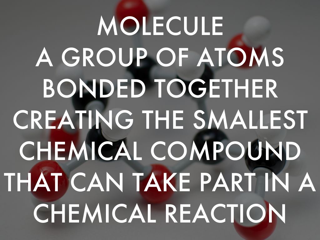 A GROUP OF ATOMS BONDED TOGETHER CREATING THE SMALLEST CHEMICAL COMPOUND THAT CAN TAKE PART IN A CHEMICAL REACTION